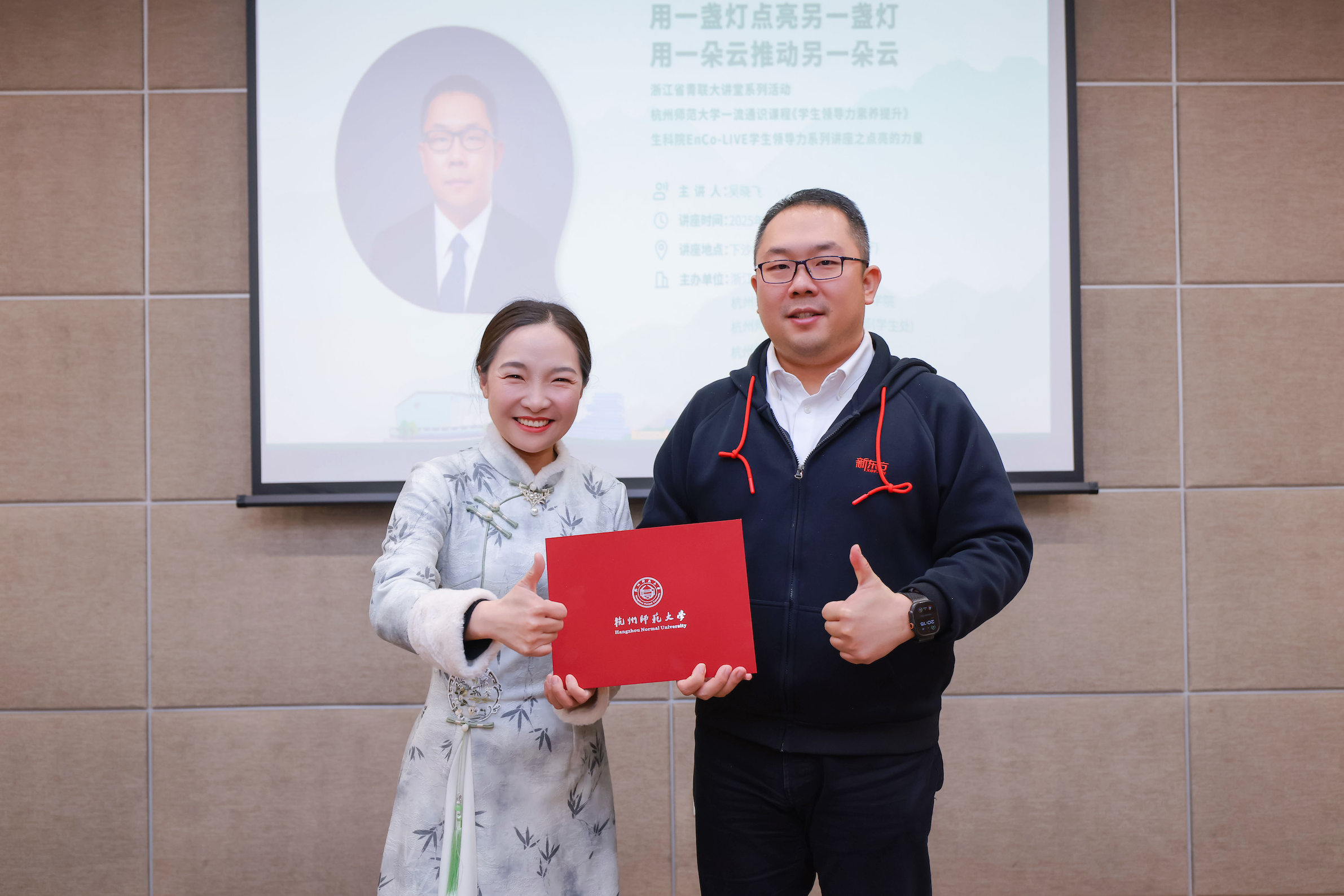 现场还进行了杭师大国产a片 “EnCo-LIVE学生领导力素养提升计划”导师及就业创业导师聘任仪式,国产a片 党委副书记王倩为吴晓飞副总裁颁发聘书,学生代表为其送上了同学们制作的“永生花”摆件,并合影留念。