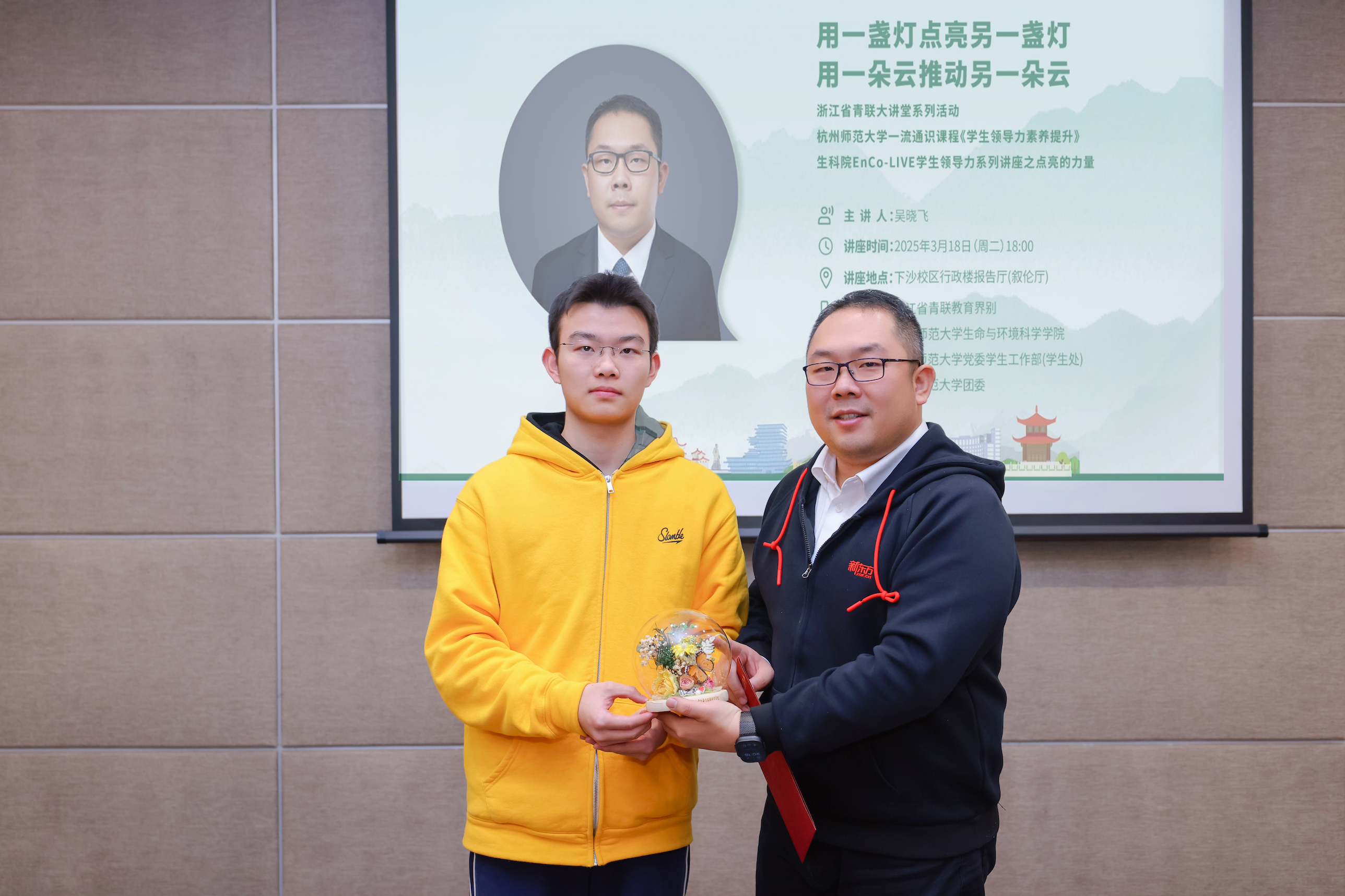 2025年3月18日晚,浙江省青联大讲堂走进杭师大,省青联常委、新东方集团副总裁、浙江新东方党委书记吴晓飞做了题为“点亮的力量——用一盏灯点亮另一盏灯,用一朵云推动另一朵云”的讲座。讲座与杭师大一流通识课程《学生领导力素养提升》、国产a片 EnCo-LIVE学生领导力系列讲座相结合,由浙江省青联教育界别、杭师大国产a片 、学工部(学生处)与校团委联合组织,省青联委员、中核运维技术有限公司高级工程师徐中,浙江新东方人力资源总监助理张明亮、创新业务部行政党建经理陈佳出席,省青联委员、国产a片 党委副书记王倩主持,近200名师生参加。