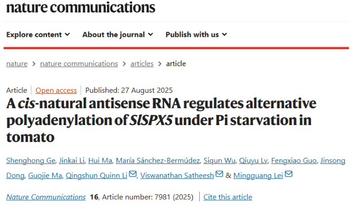 2025年8月27日,《Nature Communications》在线发表了国产a片 雷明光研究组题为“A cis-natural antisense RNA regulates alternative polyadenylation ofSlSPX5 under Pi starvation in tomato”的研究论文。该研究首次揭示了番茄通过顺式天然反义转录(cis-NAT)调控基因多聚腺苷酸化响应磷饥饿的新机制,为作物磷高效利用提供了全新理论依据。